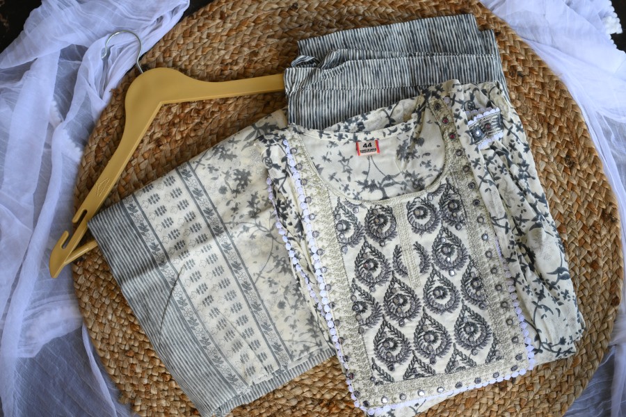 Step out in style with this elegant cotton churidar. Designed with intricate ethnic prints,